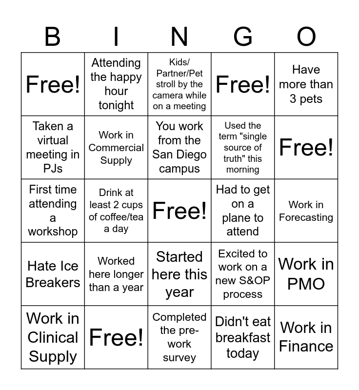 This bingo card has a free space and 24 words: Worked here longer than a year, Free!, You work from the San Diego campus, Work in Clinical Supply, Have more than 3 pets, Free!, Taken a virtual meeting in PJs, Attending the happy hour tonight, Had to get on a plane to attend, Started here this year, Used the term "single source of truth" this morning, First time attending a workshop, Excited to work on a new S&OP process, Work in PMO, Work in Commercial Supply, Didn't eat breakfast today, Work in Forecasting, Kids/ Partner/Pet stroll by the camera while on a meeting, Free!, Drink at least 2 cups of coffee/tea a day, Work in Finance, Hate Ice Breakers, Free! and Completed the pre-work survey.