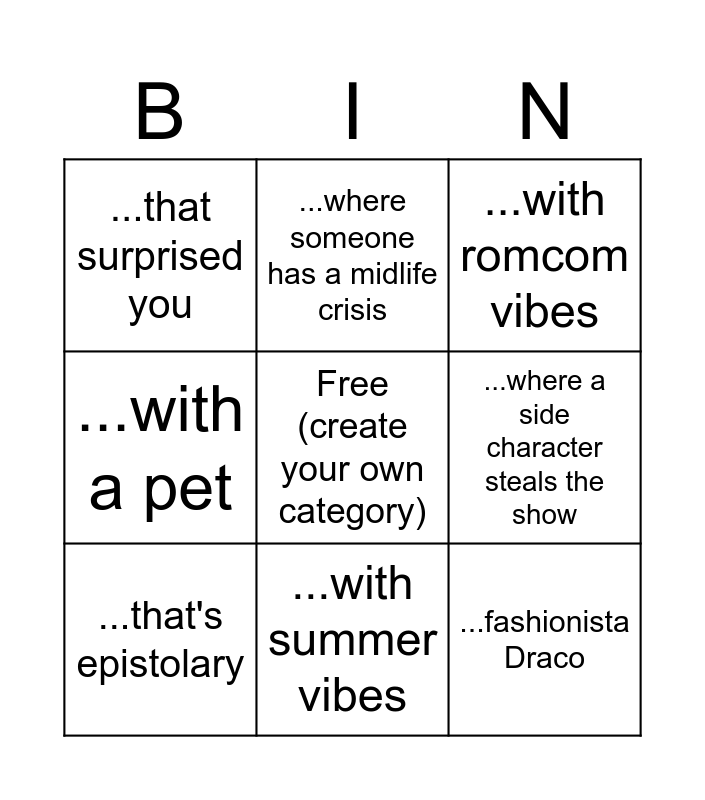 This bingo card has a free space and 8 words: ...where a side character steals the show, ...with romcom vibes, ...where someone has a midlife crisis, ...that's epistolary, ...that surprised you, ...fashionista Draco, ...with a pet and ...with summer vibes.