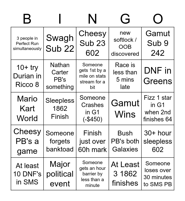 This bingo card has a free space and 24 words: Someone forgets banktoad, Major political event, Someone gets 1st by a mile on stats stream for a bit, At least 10 DNF's in SMS, Gamut Sub 9 242, 3 people in Perfect Run simultaneously, 10+ try Durian in Ricco 8, Swagh Sub 22, Gamut Wins, Finish just over 60h mark, Race is less than 5 mins late, Mario Kart World, Bush PB's both Galaxies, 30+ hour sleepless 602, Nathan Carter PB's something, At Least 3 1862 finishes, Fizz 1 star in G1 when 2nd finishes 64, Cheesy Sub 23 602, DNF in Greens, Sleepless 1862 Finish, Someone loses over 30 minutes to SMS PB, Cheesy PB's a game, new softlock / OOB discovered and Someone gets an hour barrier by less than a minute.
