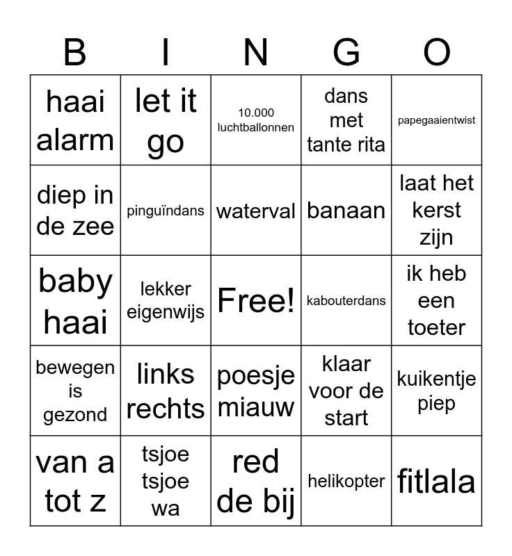 This bingo card has a free space and 33 words: baila bailalaa, daba die daba daa, lekker eigenwijs, hupsakee!, bewegen is gezond, pinguïndans, papegaaientwist, van a tot z, let it go, licht, waterval, 10.000 luchtballonnen, hoofd, schouders, knie en teen, hokey pokey, kabouterdans, laat het kerst zijn, tsjoe tsjoe wa, baby haai, links rechts, klaar voor de start, poesje miauw, happy, haai alarm, ik heb een toeter, red de bij, fitlala, dans met tante rita, banaan, diep in de zee, kuikentje piep, feest, helikopter and de wielen van de bus.