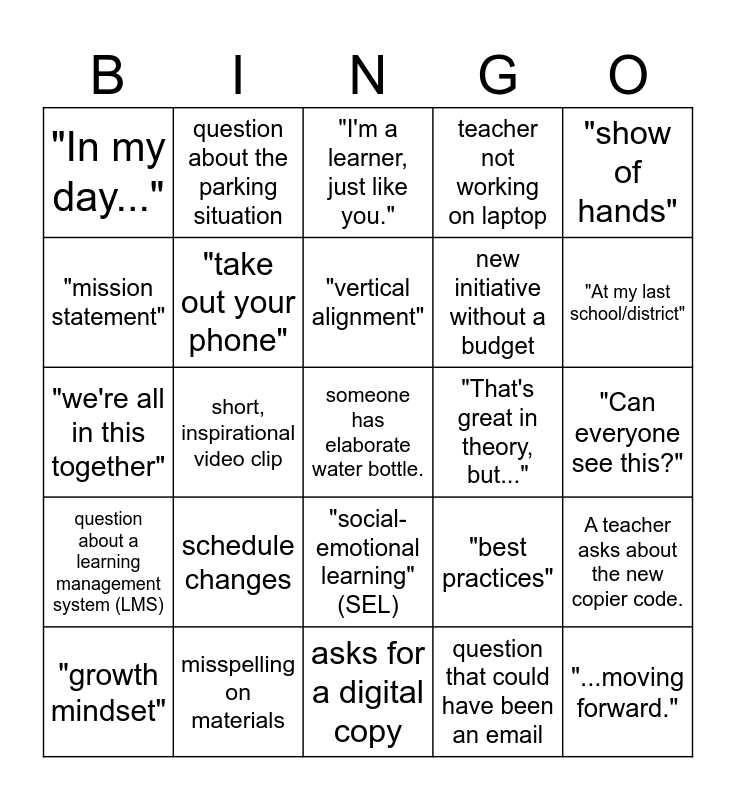 This bingo card has 95 words: asked to stand up and stretch, "data-driven instruction", question that could have been an email, metaphor that involves sports., phone rings, Wi-Fi doesn't work, "21st-century learners", misspelling on materials, acronym used without explaining it, "synergy", brings a reusable cup, speaker mentions their own school days, presenter's technology fails, "vertical alignment", someone complains about temperature in the room, "In my day...", "At my last school/district", pre-made slide deck from a company., new teacher is introduced., "low-hanging fruit", "building a positive school culture", presenter tells a joke that doesn't land, "gamification", fire alarm goes off, teacher not working on laptop, "mission statement", poll or survey tool (like Kahoot or Mentimeter), new initiative without a budget, "restorative justice", new district administrator, schedule changes, specific test or mentioned by name, "turn and talk", "professional learning communities" (PLCs), "growth mindset", "flipped classroom", asks for a digital copy, screen is blurry, "we're all in this together", "differentiated instruction", A teacher asks about the new copier code., short, inspirational video clip, "social-emotional learning" (SEL), "show of hands", "best practices", "That's great in theory, but...", "stakeholders", Someone wearing a backpack., "high-stakes testing", "new security protocol", whiteboard or flip chart is used, "rigor", "...moving forward.", teacher brings snacks, "student engagement", clicker doesn't work, "interdisciplinary projects", "cross curricular", "paradigm shift", payroll or benefits question, "take out your phone", "authentic learning", mispronounced colleague's name, "scaffolding", "building relationships", icebreaker that no one enjoys, summer vacation is discussed, "new attendance policy", "I'm a learner, just like you.", "student voice", "life long learner", "find a partner.", someone has elaborate water bottle., "grit", "pedagogy", "teacher leadership.", lights are turned off, T"backwards design", Someone mentions "differentiation by content, process, or product.", question about the parking situation, microphone squeals, "inquiry-based learning", colleague mentions teaching a new subject, mention of new bell schedule., "Can everyone see this?", question about a learning management system (LMS), new district-wide theme/focus, "post-pandemic era", question about the dress code, "call to action", new club or activity mentioned, polite but firm critique of a policy, use of laser pointer, "efficient with our time" and "respectful of your time".