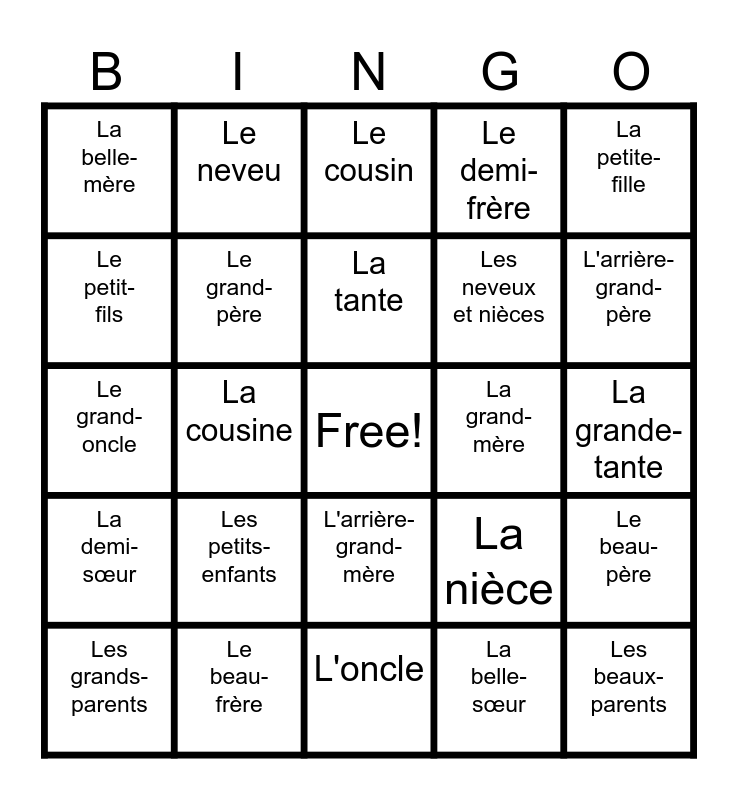 This bingo card has a free space and 24 words: Les grands-parents, Les petits-enfants, La tante, La belle-sœur, La petite-fille, La belle-mère, Le neveu, Le cousin, La grand-mère, La grande-tante, Le grand-oncle, Le grand-père, La nièce, Le beau-père, Le petit-fils, Le beau-frère, L'oncle, Le demi-frère, L'arrière-grand-père, La demi-sœur, La cousine, L'arrière-grand-mère, Les neveux et nièces and Les beaux-parents.
