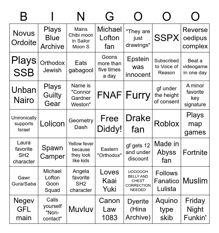 This bingo card has a free space and 48 words: UOOOOOH BELLY AND CHEST CORRECTION NEEDED, Subscribed to Voice of Reason, Canon Law 1083, Lolicon, Name is "Connor Gardner Weston", Plays map games, Plays Blue Archive, Calls yourself "Non-contact", SSPX, Eastern "Orthodox", Reverse oedipus complex, Michael Lofton fan, gf under the height of consent, Furry, Gawr Gura/Saba, Roblox, Plays SSB, Beat a videogame in one day, Follows Fanatico Lulista, "They are just drawings", Epstein was innocent, Geometry Dash, Novus Ordoite, Orthodox Jewish, Muslim, Eats gabagool, A minor favorite key signature, Negev GFL main, FNAF, Plays Guilty Gear, Aquino type skib, Drake fan, Fortnite, Michael Lofton Goon Squad, Unironically supports Israel, gf gets 12 and under discount, Made in Abyss fan, Unban Nairo, Yellow fever because they look like kids, Angela favorite SH2 character, Laura favorite SH2 character, Friday Night Funkin', Mains Chibi moon in Sailor Moon S, Muvluv, Goons more than five times a day, Loves Kaai Yuki, Spawn Camper and Dyerite (Hina Archive).