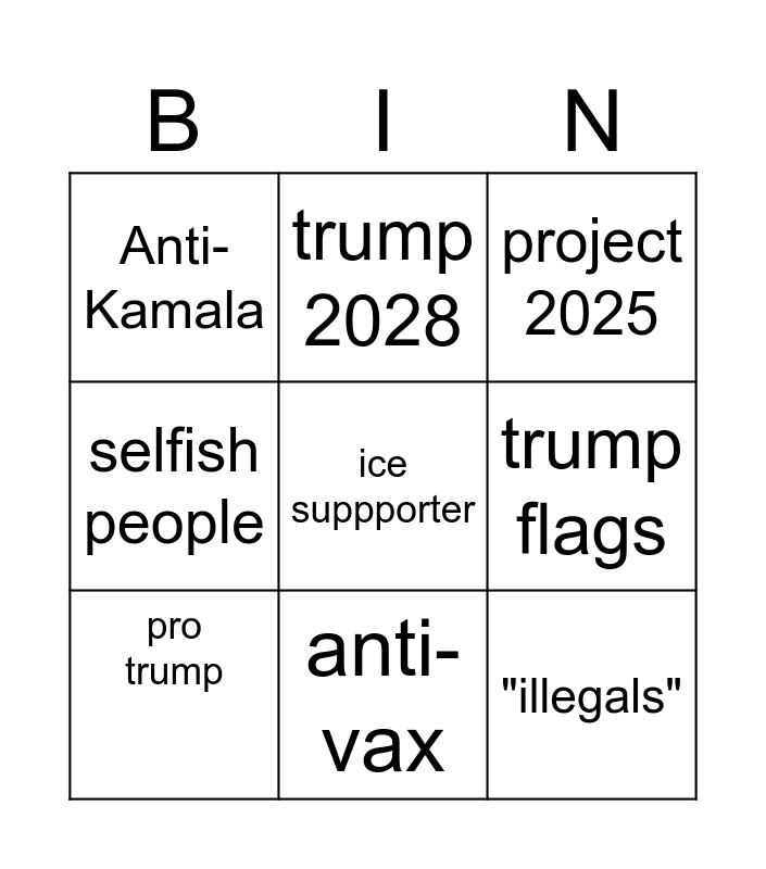 This bingo card has 9 words: pro trump, project 2025, trump 2028, selfish people, Anti-Kamala, trump flags, ice suppporter, "illegals" and anti-vax.