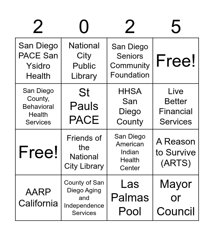This bingo card has 16 words: County of San Diego Aging and Independence Services, A Reason to Survive (ARTS), San Diego Seniors Community Foundation, San Diego PACE San Ysidro Health, Free!, National City Public Library, San Diego American Indian Health Center, Las Palmas Pool, San Diego County, Behavioral Health Services, St Pauls PACE, AARP California, Free!, Friends of the National City Library, Live Better Financial Services, HHSA San Diego County and Mayor or Council.