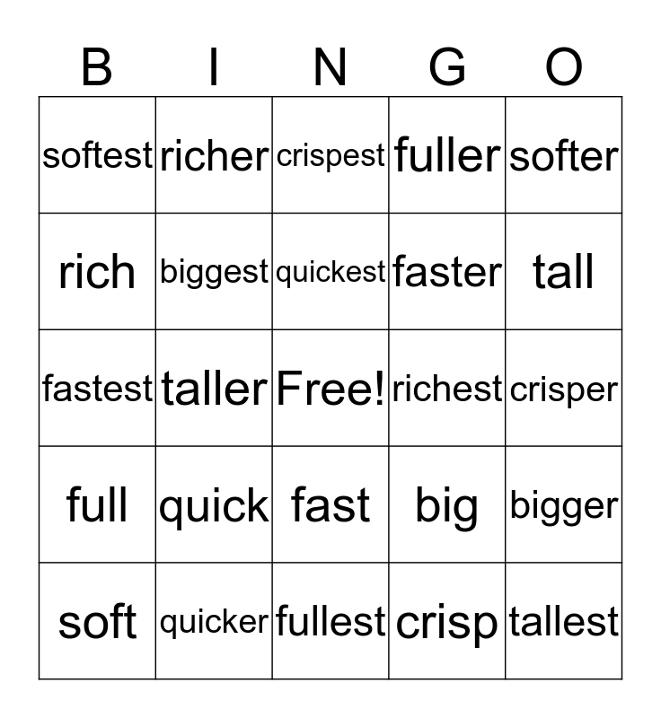 This bingo card has a free space and 24 words: quick, quicker, quickest, soft, softer, softest, rich, richer, richest, fast, faster, fastest, big, bigger, biggest, crisp, crisper, crispest, tall, taller, tallest, full, fuller and fullest.