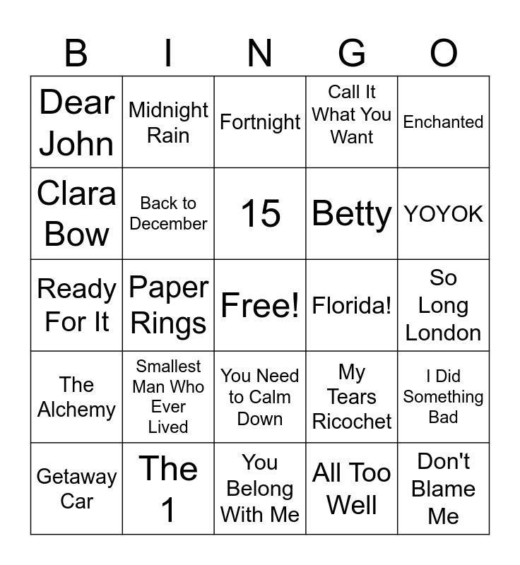 This bingo card has a free space and 59 words: 22, The 1, Afterglow, The Alchemy, All Too Well, The Archer, Back to December, Bejeweled, Betty, The Black Dog, Call It What You Want, Champagne Problems, Clara Bow, Clean, Cruel Summer, Dear John, Don't Blame Me, Enchanted, Exile, 15, Florida!, Fortnight, Getaway Car, I Did Something Bad, Invisible String, Is It Over Now, Karma, LOML, YOYOK, Maroon, Lover, Love Story, Mad Woman, Mastermind, Midnight Rain, Mr. Perfectly Fine, Our Song, Paper Rings, Picture to Burn, Ready For It, Run, Smallest Man Who Ever Lived, So Long London, Speak Now, State of Grace, Story of Us, Style, Welcome to New York, You Need to Calm Down, You Belong With Me, Willow, August, Teardrops on My Guitar, Stay Stay Stay, Red, My Tears Ricochet, New Romantics, So High School and Look What You Made Me Do.