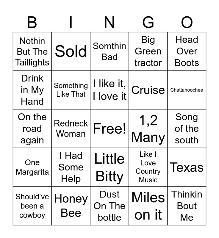This bingo card has a free space and 73 words: Thank God I’m A country Boy, It’s Great Day to Be alive, Nothin But The Taillights, Knee Deep, Broadway Girl, Body Like A Backroad, One Margarita, Daddy's money, Like I Love Country Music, One Thing At A Time, Aint No Love In Oklahoma, Boot Scootin Boogie, Something Like That, Song of the south, All My Ex’s live in Texas, Sold, Dust On The bottle, Drink in My Hand, Beer Never Broke My Heart, 1,2 Many, I like it, I love it, Big Green tractor, Head Over Boots, Beer for my Horses, Should’ve been a cowboy, She’s Country, Pour Me A Drink, Heartache Medication, Whiskey Glasses, Play it Again, Honey Bee, Knockin Boots, Watermelon Crawl, Red Solo Cup, Redneck Woman, Don’t Rock The Jukebox, Heads Carolina, Tails California, When It Rains It Pours, Thinkin Bout Me, American Kids, Miles on it, I Had Some Help, Cowgirls, Wagon Wheel, Spin you Around, Cruise, Somthin Bad, Mama’s Broken Heart, Louisiana Woman, Mississippi Man, On the road again, Bad,Bad Leroy Brown, Any Man of Mine, Your Man, Jolene, Why Don’t We just Dance, Take me Home Country Roads, Stuck Like Glue, Little Bitty, Fact, I’m A survivor, These Boots Are Made for Walkin, Save a Horse, Country Girl, Chattahoochee, Friends In Low Places, Don’t Come Home A Drinkin, I feel lucky, This Kiss, Texas, You look like you love me, You Proof, Day Late and a Buck Short and What I Want.