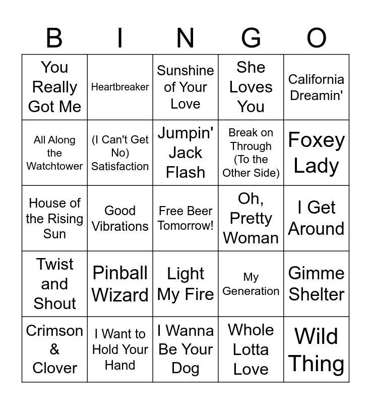 This bingo card has a free space and 40 words: Born to Be Wild, House of the Rising Sun, Fortunate Son, (I Can't Get No) Satisfaction, I Want to Hold Your Hand, Light My Fire, Jumpin' Jack Flash, Louie Louie, California Dreamin', Twist and Shout, Good Vibrations, She Loves You, Wild Thing, I Get Around, Oh, Pretty Woman, Pinball Wizard, All Day and All of The Night, You Really Got Me, Hey Jude, Sunshine of Your Love, Gimme Shelter, Whole Lotta Love, Break on Through (To the Other Side), All Along the Watchtower, Magic Carpet Ride, I Fought the Law, Bad Moon Rising, Green River, Somebody to Love, Ramble On, Purple Haze, Crimson & Clover, Don't Let Me Be Misunderstood, My Generation, Foxey Lady, I Wanna Be Your Dog, Turn! Turn! Turn!, Hello, I Love You, Heartbreaker and Time of the Season.