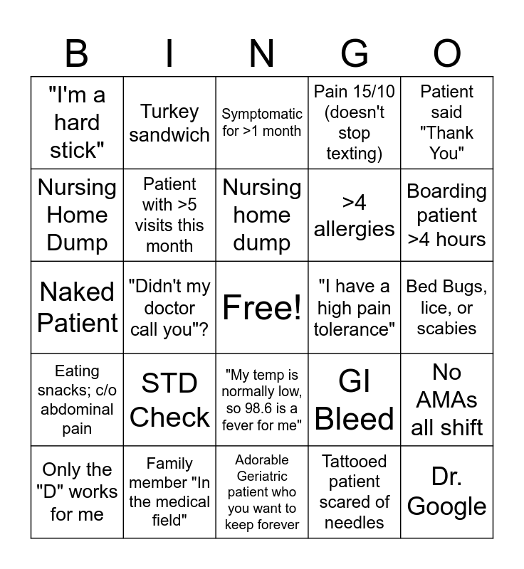 This bingo card has a free space and 24 words: STD Check, Family member "In the medical field", Nursing home dump, Only the "D" works for me, Patient said "Thank You", "I'm a hard stick", Nursing Home Dump, Turkey sandwich, "I have a high pain tolerance", "My temp is normally low, so 98.6 is a fever for me", >4 allergies, Naked Patient, GI Bleed, No AMAs all shift, Patient with >5 visits this month, Tattooed patient scared of needles, Bed Bugs, lice, or scabies, Symptomatic for >1 month, Boarding patient >4 hours, "Didn't my doctor call you"?, Dr. Google, Eating snacks; c/o abdominal pain, Pain 15/10 (doesn't stop texting) and Adorable Geriatric patient who you want to keep forever.