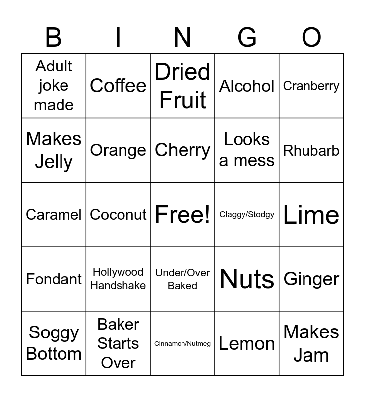 This bingo card has a free space and 24 words: Hollywood Handshake, Baker Starts Over, Cherry, Soggy Bottom, Cranberry, Adult joke made, Makes Jelly, Coffee, Claggy/Stodgy, Under/Over Baked, Looks a mess, Caramel, Nuts, Ginger, Orange, Lemon, Lime, Dried Fruit, Rhubarb, Coconut, Makes Jam, Fondant, Alcohol and Cinnamon/Nutmeg.