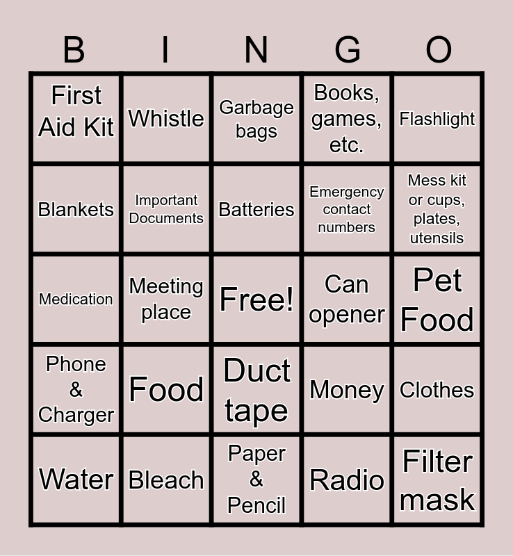 This bingo card has a free space and 24 words: Water, Food, Batteries, Radio, Flashlight, First Aid Kit, Whistle, Garbage bags, Can opener, Pet Food, Medication, Important Documents, Money, Clothes, Blankets, Bleach, Paper & Pencil, Books, games, etc., Mess kit or cups, plates, utensils, Phone & Charger, Meeting place, Duct tape, Emergency contact numbers and Filter mask.