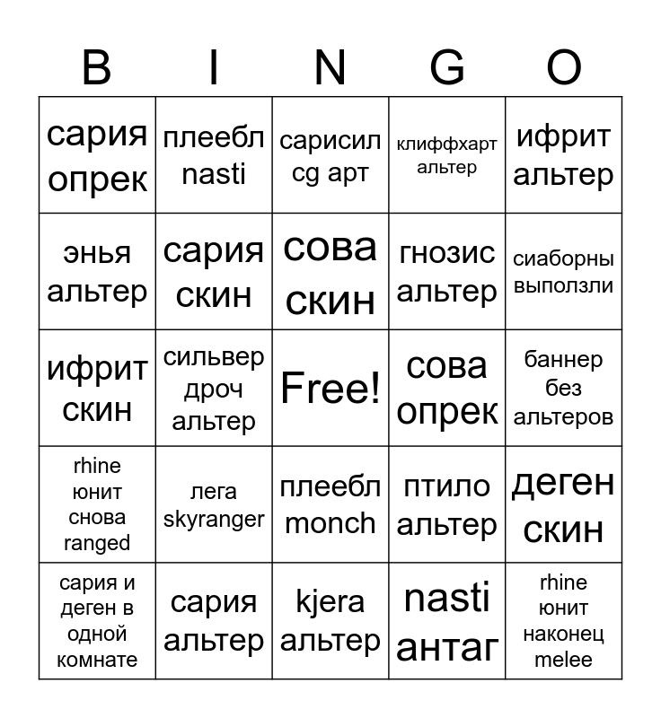 This bingo card has a free space and 24 words: лега skyranger, сария альтер, сова скин, сария и деген в одной комнате, ифрит альтер, сария опрек, энья альтер, плеебл nasti, сова опрек, плеебл monch, гнозис альтер, ифрит скин, птило альтер, деген скин, сария скин, nasti антаг, баннер без альтеров, сарисил cg арт, сиаборны выползли, сильвер дроч альтер, rhine юнит наконец melee, rhine юнит снова ranged, клиффхарт альтер and kjera альтер.