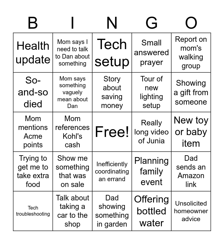 This bingo card has a free space and 24 words: Show me something that was on sale, Talk about taking a car to the shop, Story about saving money, Tech troubleshooting, Report on mom's walking group, Health update, So-and-so died, Mom says I need to talk to Dan about something, Really long video of Junia, Inefficiently coordinating an errand, Tour of new lighting setup, Mom mentions Acme points, Planning family event, Dad sends an Amazon link, Mom says something vaguely mean about Dan, Offering bottled water, New toy or baby item, Tech setup, Showing a gift from someone, Mom references Kohl's cash, Unsolicited homeowner advice, Trying to get me to take extra food, Small answered prayer and Dad showing something in garden.
