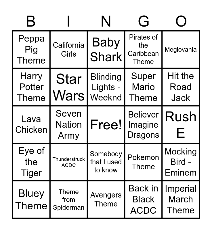 This bingo card has a free space and 27 words: Pokemon Theme, Oompa Loompa Theme, Super Mario Theme, Avengers Theme, Harry Potter Theme, Baby Shark, California Girls, Eye of the Tiger, Believer Imagine Dragons, Mocking Bird - Eminem, Lava Chicken, Pirates of the Caribbean Theme, Bluey Theme, Theme from Spiderman, Hit the Road Jack, Chicken Nugget Theme, Star Wars, Blinding Lights -Weeknd, Thunderstruck ACDC, Peppa Pig Theme, Rush E, Back in Black ACDC, Seven Nation Army, Imperial March Theme, Somebody that I used to know, Meglovania and New Divide - Linkin Park.