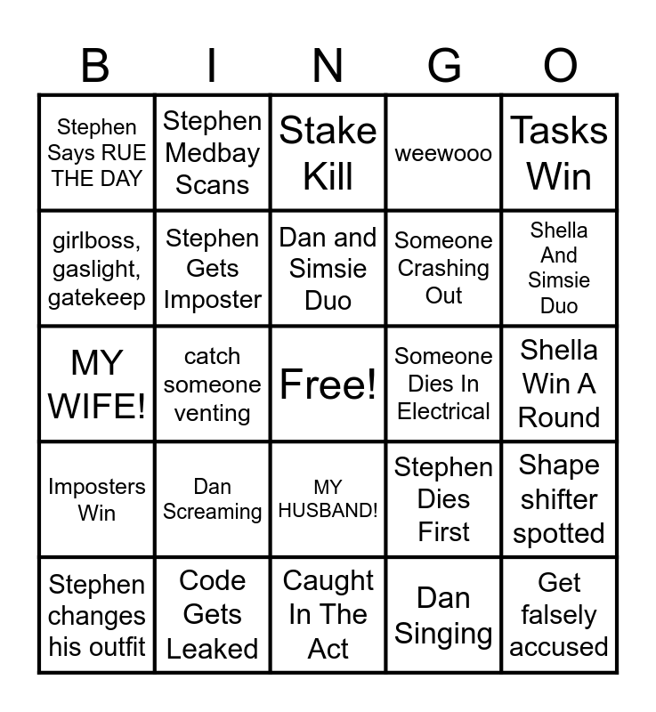 This bingo card has a free space and 24 words: Dan Screaming, Code Gets Leaked, Dan and Simsie Duo, Stephen changes his outfit, Tasks Win, Stephen Says RUE THE DAY, girlboss, gaslight, gatekeep, Stephen Medbay Scans, Someone Dies In Electrical, MY HUSBAND!, Someone Crashing Out, MY WIFE!, Stephen Dies First, Shape shifter spotted, Stephen Gets Imposter, Dan Singing, Shella Win A Round, Stake Kill, Shella And Simsie Duo, catch someone venting, Get falsely accused, Imposters Win, weewooo and Caught In The Act.