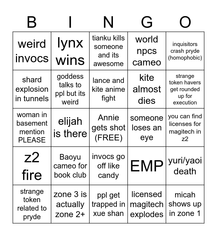 This bingo card has a free space and 24 words: Baoyu cameo for book club, zone 3 is actually zone 2+, lance and kite anime fight, strange token related to pryde, inquisitors crash pryde (homophobic), weird invocs, shard explosion in tunnels, lynx wins, someone loses an eye, invocs go off like candy, kite almost dies, woman in basement mention PLEASE, EMP, yuri/yaoi death, goddess talks to ppl but its weird, licensed magitech explodes, you can find licenses for magitech in z2, tianku kills someone and its awesome, strange token havers get rounded up for execution, elijah is there, micah shows up in zone 1, z2 fire, world npcs cameo and ppl get trapped in xue shan.