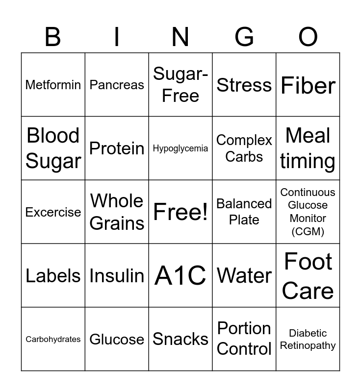 This bingo card has a free space and 24 words: Insulin, Glucose, Hypoglycemia, Carbohydrates, Fiber, Metformin, Blood Sugar, Pancreas, Balanced Plate, A1C, Complex Carbs, Excercise, Water, Foot Care, Protein, Portion Control, Continuous Glucose Monitor (CGM), Sugar-Free, Meal timing, Whole Grains, Diabetic Retinopathy, Labels, Stress and Snacks.