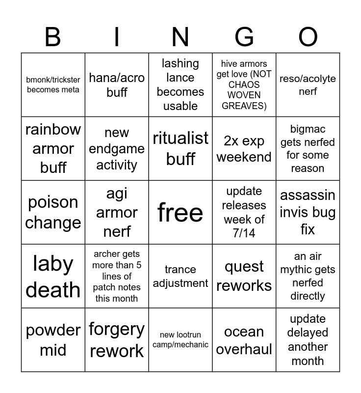 This bingo card has a free space and 24 words: archer gets more than 5 lines of patch notes this month, forgery rework, ritualist buff, powder mid, reso/acolyte nerf, bmonk/trickster becomes meta, rainbow armor buff, hana/acro buff, update releases week of 7/14, trance adjustment, 2x exp weekend, poison change, quest reworks, an air mythic gets nerfed directly, new endgame activity, ocean overhaul, assassin invis bug fix, lashing lance becomes usable, bigmac gets nerfed for some reason, agi armor nerf, update delayed another month, laby death, hive armors get love (NOT CHAOS WOVEN GREAVES) and new lootrun camp/mechanic.