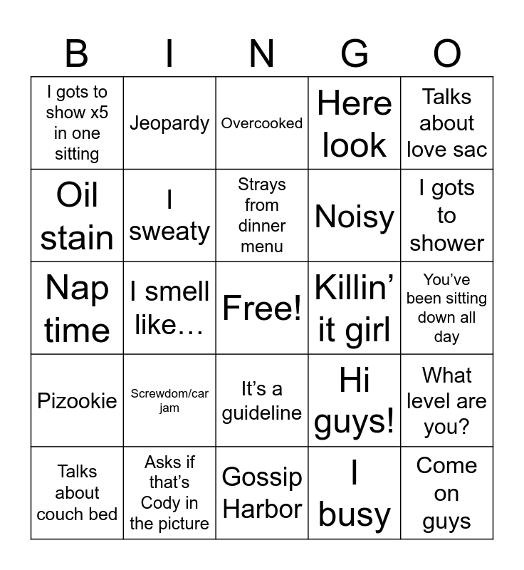 This bingo card has a free space and 24 words: Screwdom/car jam, Asks if that’s Cody in the picture, Strays from dinner menu, Talks about couch bed, Talks about love sac, I gots to show x5 in one sitting, Oil stain, Jeopardy, Killin’ it girl, It’s a guideline, Noisy, Nap time, Hi guys!, What level are you?, I sweaty, I busy, You’ve been sitting down all day, Overcooked, I gots to shower, I smell like…, Come on guys, Pizookie, Here look and Gossip Harbor.