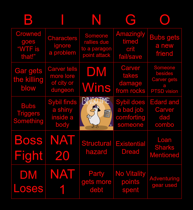 This bingo card has a free space and 24 words: NAT 20, NAT 1, DM Wins, DM Loses, Bubs gets a new friend, Crowned goes “WTF is that!”, Gar gets the killing blow, Characters ignore a problem, Sybil does a bad job comforting someone, Structural hazard, Carver takes damage from rocks, Bubs Triggers Something, Existential Dread, Loan Sharks Mentioned, Carver tells more lore of city or dungeon, No Vitality points spent, Edard and Carver dad combo, Someone rallies due to a paragon point attack, Someone besides Carver gets a PTSD vision, Sybil finds a shiny inside a body, Adventuring gear used, Boss Fight, Amazingly timed crit fail/save and Party gets more debt.