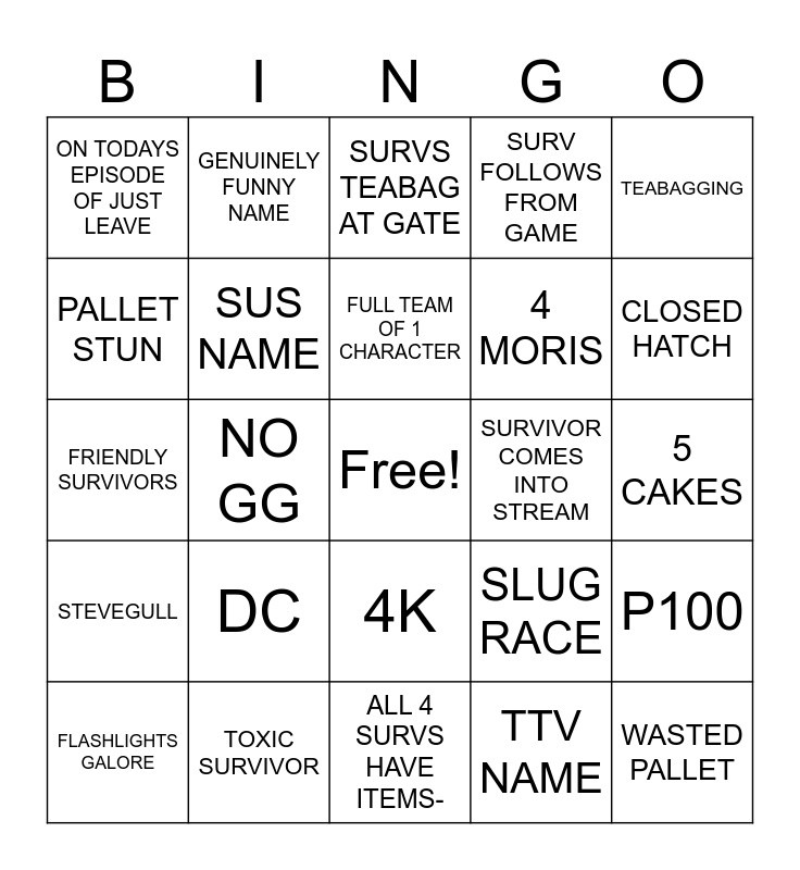 This bingo card has a free space and 24 words: DC, TOXIC SURVIVOR, FULL TEAM OF 1 CHARACTER, FLASHLIGHTS GALORE, TEABAGGING, ON TODAYS EPISODE OF JUST LEAVE, PALLET STUN, GENUINELY FUNNY NAME, SURVIVOR COMES INTO STREAM, 4K, 4 MORIS, FRIENDLY SURVIVORS, SLUG RACE, P100, SUS NAME, TTV NAME, 5 CAKES, SURVS TEABAG AT GATE, CLOSED HATCH, NO GG, WASTED PALLET, STEVEGULL, SURV FOLLOWS FROM GAME and ALL 4 SURVS HAVE ITEMS-.