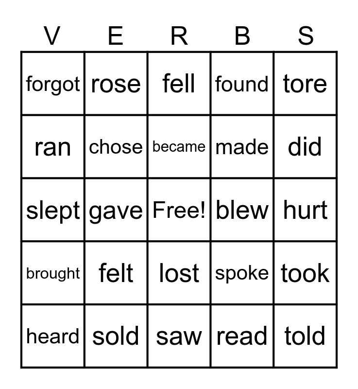 This bingo card has a free space and 75 words: caught, drank, fell, sang, dug, shut, hung, began, ate, bought, drove, built, became, ran, grew, gave, said, told, left, tore, drew, slept, chose, rose, found, met, sent, hid, wrote, stood, spun, hit, kept, spoke, did, made, sank, went, hurt, read, led, fought, held, kept, rode, got, heard, forgot, paid, stuck, thought, lost, let, stung, put, lent, broke, knew, knew, left, felt, was, were, meant, rang, blew, held, wove, had, took, brought, sold, came, saw and flew.