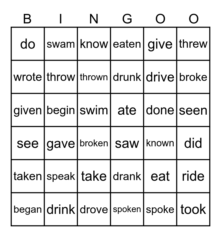 This bingo card has 45 words: rode, given, driven, broken, drank, did, know, begun, give, saw, eaten, begin, seen, done, spoken, known, ride, drive, ridden, drunk, swam, began, eat, do, swum, swim, speak, break, see, ate, knew, gave, drove, spoke, drink, broke, take, took, taken, throw, threw, thrown, write, wrote and written.