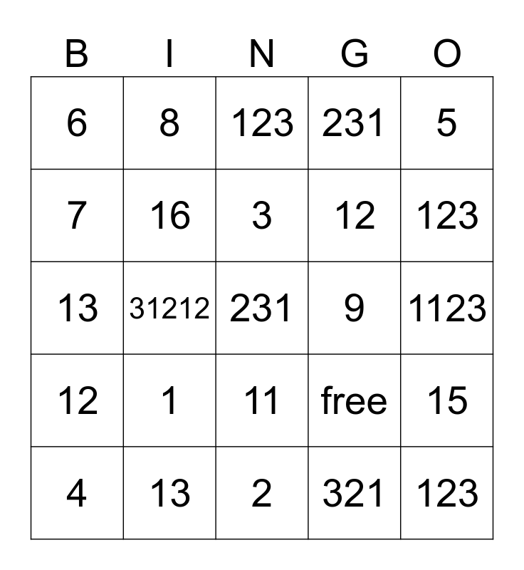 This bingo card has 25 words: 1, 2, 3, 4, 5, 6, 7, 8, 9, 11, 12, 13, free, 15, 16, 123, 1123, 123, 123, 31212, 231, 13, 12, 231 and 321.