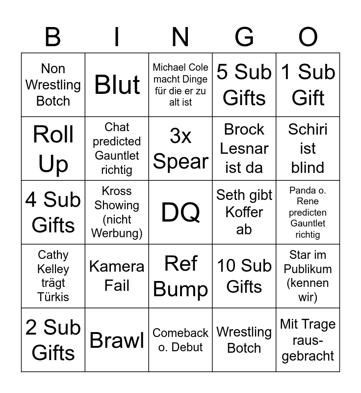 This bingo card has 25 words: Kamera Fail, Comeback o. Debut, 3x Spear, 2 Sub Gifts, 1 Sub Gift, Non Wrestling Botch, Roll Up, Blut, Seth gibt Koffer ab, Ref Bump, Brock Lesnar ist da, 4 Sub Gifts, 10 Sub Gifts, Star im Publikum (kennen wir), Chat predicted Gauntlet richtig, Mit Trage raus-gebracht, Panda o. Rene predicten Gauntlet richtig, Michael Cole macht Dinge für die er zu alt ist, Schiri ist blind, Kross Showing (nicht Werbung), DQ, Brawl, Cathy Kelley trägt Türkis, 5 Sub Gifts and Wrestling Botch.