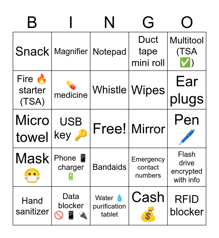 This bingo card has a free space and 24 words: Phone ๐ฑ charger ๐, Data blocker ๐ซ ๐ฑ ๐, Whistle, Hand sanitizer, Multitool (TSA โ ๏ธ), Snack, Fire ๐ฅ starter (TSA), Magnifier, Mirror, Bandaids, Wipes, Micro towel, Emergency contact numbers, Flash drive encrypted with info, ๐ medicine, Cash ๐ฐ, Pen ๐, Notepad, Ear plugs, USB key ๐, RFID blocker, Mask ๐ท, Duct tape mini roll and Water ๐ง purification tablet.