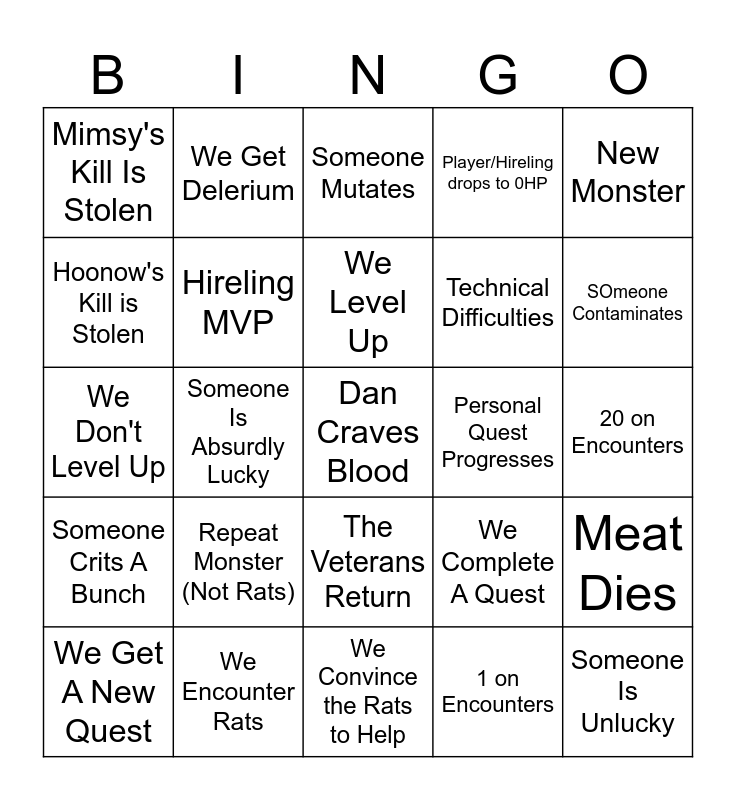 This bingo card has a free space and 24 words: Repeat Monster (Not Rats), We Encounter Rats, We Level Up, We Get A New Quest, New Monster, Mimsy's Kill Is Stolen, Hoonow's Kill is Stolen, We Get Delerium, Personal Quest Progresses, The Veterans Return, Technical Difficulties, We Don't Level Up, We Complete A Quest, Meat Dies, Hireling MVP, 1 on Encounters, 20 on Encounters, Someone Mutates, SOmeone Contaminates, Someone Is Absurdly Lucky, Someone Is Unlucky, Someone Crits A Bunch, Player/Hireling drops to 0HP and We Convince the Rats to Help.