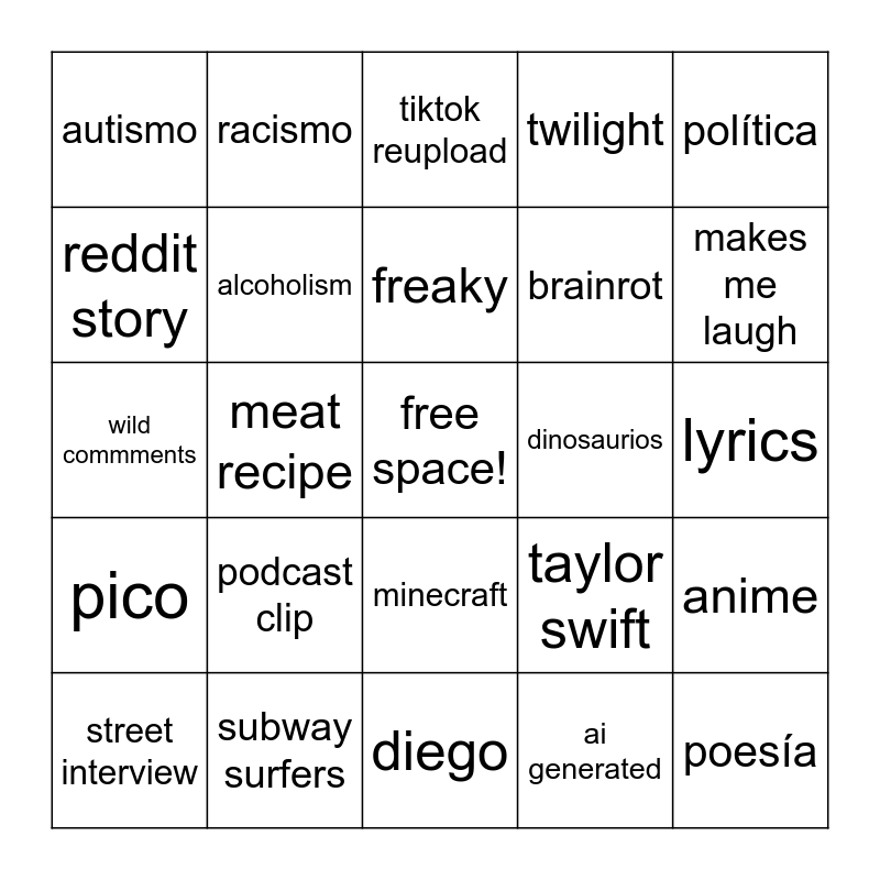 This bingo card has a free space and 24 words: podcast clip, subway surfers, freaky, street interview, política, autismo, reddit story, racismo, dinosaurios, minecraft, brainrot, wild commments, taylor swift, anime, alcoholism, ai generated, lyrics, tiktok reupload, makes me laugh, meat recipe, poesía, pico, twilight and diego.