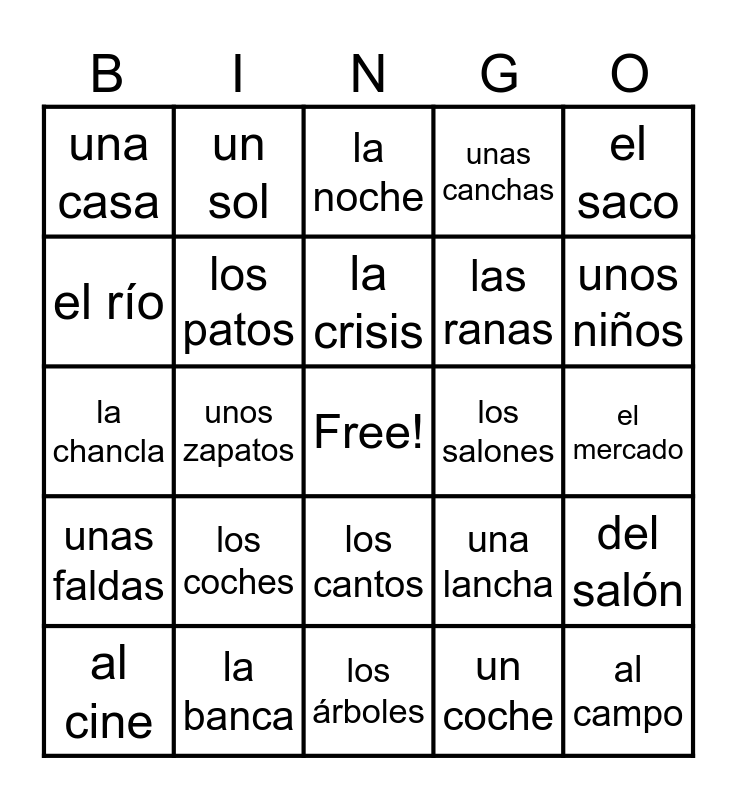 This bingo card has a free space and 24 words: al cine, los coches, la crisis, un coche, el saco, una casa, un sol, la noche, los salones, el mercado, la chancla, los patos, una lancha, del salón, el río, la banca, los árboles, unas canchas, unos niños, unas faldas, unos zapatos, los cantos, las ranas and al campo.