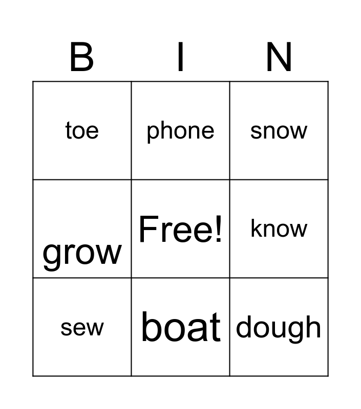 This bingo card has a free space and 10 words: boat, snow, toe, dough, grow, sew, phone, throw, know and snow.