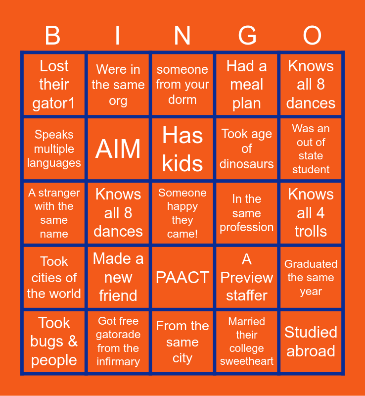 This bingo card has a free space and 24 words: Made a new friend, Got free gatorade from the infirmary, Has kids, Took bugs & people, Knows all 8 dances, Lost their gator1, Speaks multiple languages, Were in the same org, In the same profession, PAACT, Took age of dinosaurs, A stranger with the same name, A Preview staffer, Graduated the same year, AIM, Married their college sweetheart, Knows all 4 trolls, someone from your dorm, Was an out of state student, Knows all 8 dances, Studied abroad, Took cities of the world, Had a meal plan and From the same city.