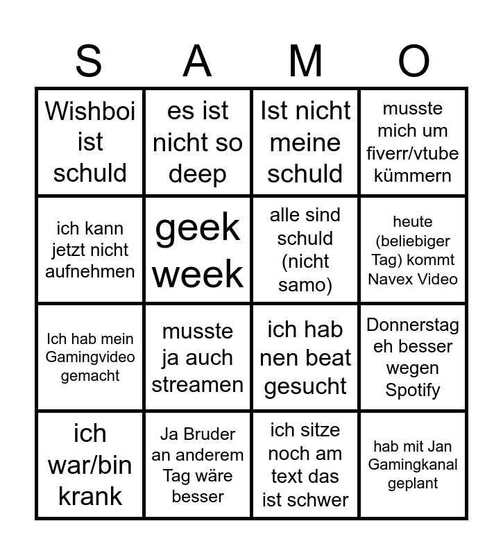 This bingo card has 16 words: Ja Bruder an anderem Tag wäre besser, Donnerstag eh besser wegen Spotify, Ist nicht meine schuld, Wishboi ist schuld, Ich hab mein Gamingvideo gemacht, es ist nicht so deep, ich hab nen beat gesucht, ich sitze noch am text das ist schwer, ich kann jetzt nicht aufnehmen, geek week, ich war/bin krank, musste mich um fiverr/vtube kümmern, musste ja auch streamen, heute (beliebiger Tag) kommt Navex Video, alle sind schuld (nicht samo) and hab mit Jan Gamingkanal geplant.
