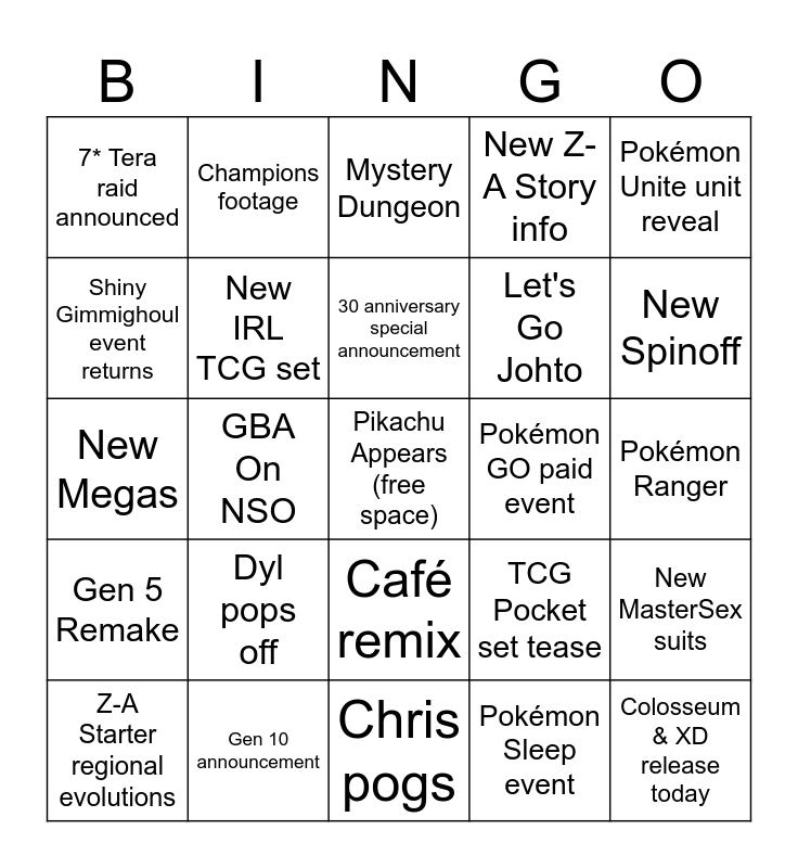 This bingo card has a free space and 24 words: Dyl pops off, Gen 10 announcement, 30 anniversary special announcement, Z-A Starter regional evolutions, Pokémon Unite unit reveal, 7* Tera raid announced, Shiny Gimmighoul event returns, Champions footage, Pokémon GO paid event, Café remix, Let's Go Johto, New Megas, TCG Pocket set tease, New MasterSex suits, New IRL TCG set, Pokémon Sleep event, Pokémon Ranger, Mystery Dungeon, New Spinoff, GBA On NSO, Colosseum & XD release today, Gen 5 Remake, New Z-A Story info and Chris pogs.