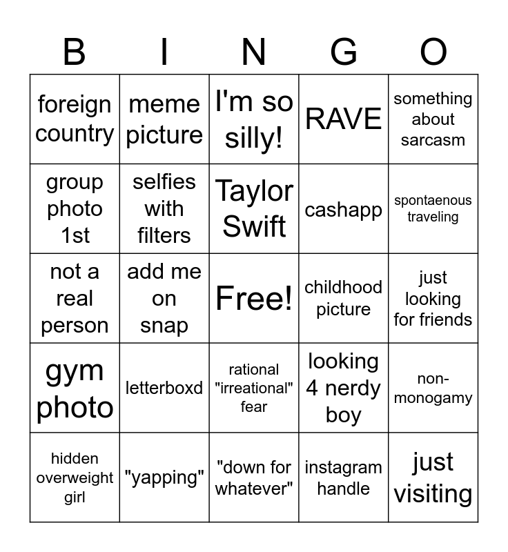 This bingo card has a free space and 24 words: letterboxd, "yapping", Taylor Swift, hidden overweight girl, something about sarcasm, foreign country, group photo 1st, meme picture, childhood picture, rational "irreational" fear, cashapp, not a real person, looking 4 nerdy boy, non-monogamy, selfies with filters, instagram handle, just looking for friends, I'm so silly!, spontaenous traveling, add me on snap, just visiting, gym photo, RAVE and "down for whatever".