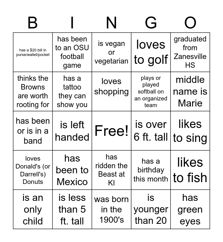 This bingo card has a free space and 29 words: is an only child, drove at least 1 hour to be here, is left handed, does NOT drink coffee, has a $20 bill in purse/wallet/pocket, is vegan or vegetarian, has a tattoo they can show you, has been to Mexico, is over 6 ft. tall, is less than 5 ft. tall, likes to sing, has green eyes, was born in the 1900's, is younger than 20, middle name is Marie, has lived in a state other than Ohio, has ridden the Beast at KI, loves Donald's (or Darrell's) Donuts, graduated from Zanesville HS, has been or is in a band, has a birthday this month, gets Italian dressing on their Adornetto's salad, plays or played softball on an organized team, thinks the Browns are worth rooting for, loves to golf, has been to an OSU football game, likes to fish, loves shopping and is a Swiftie.