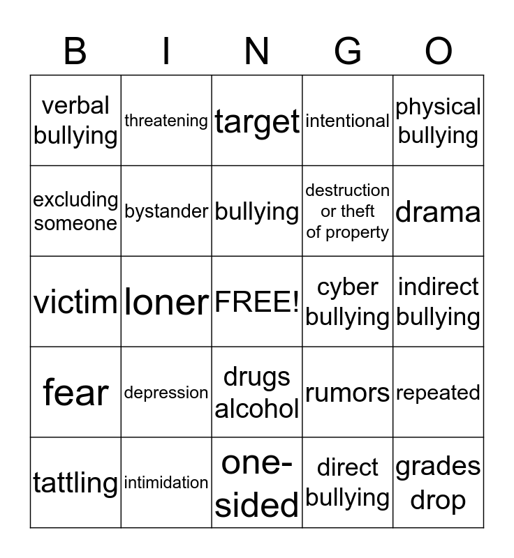 This bingo card has a free space and 24 words: depression, intimidation, bullying, tattling, physical bullying, verbal bullying, excluding someone, threatening, cyber bullying, drugs alcohol, destruction or theft of property, victim, rumors, repeated, bystander, direct bullying, indirect bullying, target, drama, loner, grades drop, fear, intentional and one-sided.
