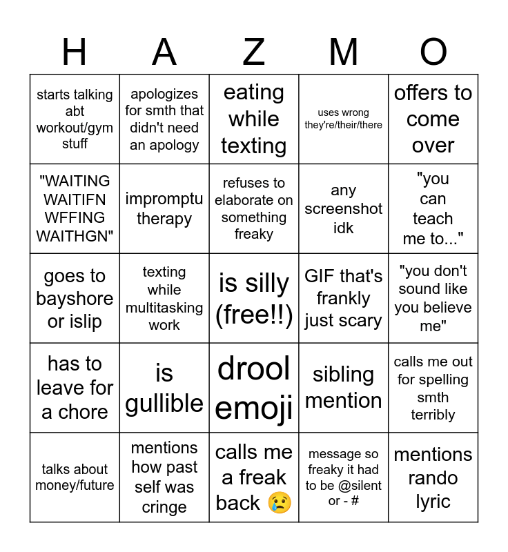 This bingo card has a free space and 35 words: gets invited to a pool party, "this reminds me of an anime...", terrible pickup line, impromptu therapy, drool emoji, uses wrong they're/their/there, "WAITING WAITIFN WFFING WAITHGN", bone chilling wink emoji, refuses to elaborate on something freaky, masochism activated, goes to bayshore or islip, offers to come over, goes ghost mode, random shirtless mention, starts talking abt workout/gym stuff, GIF that's frankly just scary, message so freaky it had to be @silent or - #, texting while multitasking work, has to leave for a chore, mentions rando lyric, sibling mention, talks about money/future, calls me out for spelling smth terribly, mentions how past self was cringe, eating while texting, "you can teach me to...", "i'll teach you to...", "Bruh", any screenshot idk, "you don't sound like you believe me", catches/gets caught, calls me a freak back 😢, is gullible, apologizes for smth that didn't need an apology and gets philosophical.