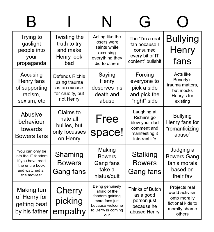 This bingo card has a free space and 24 words: Shaming Bowers Gang fans, Cherry picking empathy, Saying Henry deserves his death and abuse, Making fun of Henry for getting beat by his father, Bullying Henry fans, Trying to gaslight people into your propaganda, Accusing Henry fans of supporting racism, sexism, etc, Twisting the truth to try and make Henry look bad, Laughing at Richie‘s go blow your dad comment and manifesting it into real life, Making Bowers Gang fans take a hiatus/quit, Forcing everyone to pick a side and pick the “right” side, Abusive behaviour towards Bowers fans, Stalking Bowers Gang fans, Judging a Bowers Gang fan’s morals based on their fav, Defends Richie using trauma as an excuse for cruelty, but not Henry, Thinks of Butch as a good person just because he abused Henry, Bullying Henry fans for “romanticizing abuse”, Acting like the losers were saints while excusing everything they did to others, Acts like Beverly‘s trauma matters, but mocks Henry’s for existing, Claims to hate all bullies, but only focusses on Henry, Projects real world activism onto morally fictional kids to morally shame others, “You can only be into the IT fandom if you have read the entire book and watched all the movies”, The “I’m a real fan because I consumed every bit of IT content” bullshit and Being genuinely afraid of the fandom gaining more fans just because welcome to Derry is coming out.