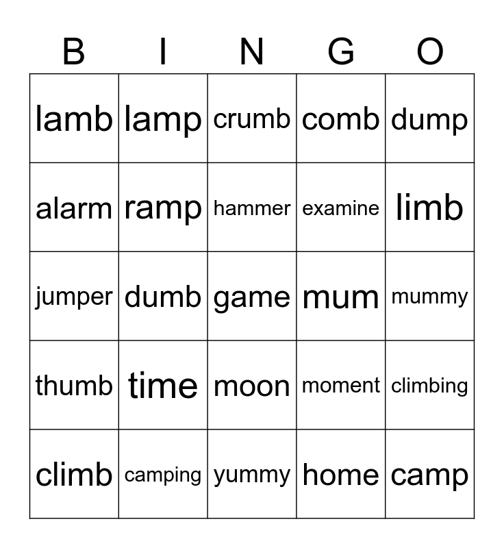This bingo card has 91 words: mum, map, moon, me, mouse, milk, mix, mud, mop, mat, mess, mouth, magic, mummy, summer, hammer, drummer, swimmer, shimmer, common, lemon, comma, yummy, tummy, jumper, camping, chimney, tomato, remember, number, timber, climbing, plumber, thumb, lamb, comb, crumb, numb, dumb, limb, climb, alarm, storm, warm, morning, moment, amount, memory, member, camera, animal, examine, among, symbol, gym, man, mum, men, moon, make, mine, most, must, many, made, move, name, home, come, same, time, game, room, farm, lamp, ramp, jump, bump, lump, stamp, camp, dump, temp, trim, swim, grim, slim, sum, gum, drum and brim.