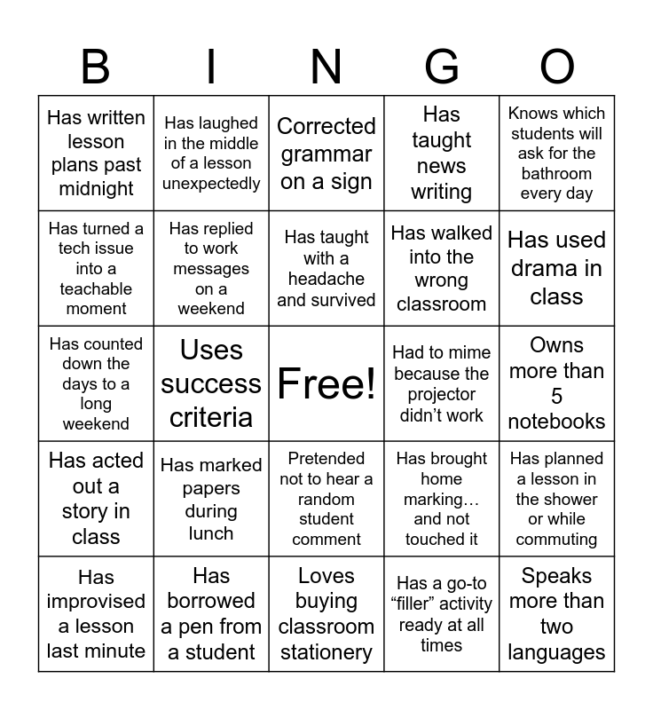 This bingo card has a free space and 24 words: Has marked papers during lunch, Has borrowed a pen from a student, Has taught with a headache and survived, Has improvised a lesson last minute, Knows which students will ask for the bathroom every day, Has written lesson plans past midnight, Has turned a tech issue into a teachable moment, Has laughed in the middle of a lesson unexpectedly, Had to mime because the projector didn’t work, Pretended not to hear a random student comment, Has walked into the wrong classroom, Has counted down the days to a long weekend, Has brought home marking… and not touched it, Has planned a lesson in the shower or while commuting, Has replied to work messages on a weekend, Has a go-to “filler” activity ready at all times, Owns more than 5 notebooks, Corrected grammar on a sign, Has used drama in class, Uses success criteria, Speaks more than two languages, Has acted out a story in class, Has taught news writing and Loves buying classroom stationery.