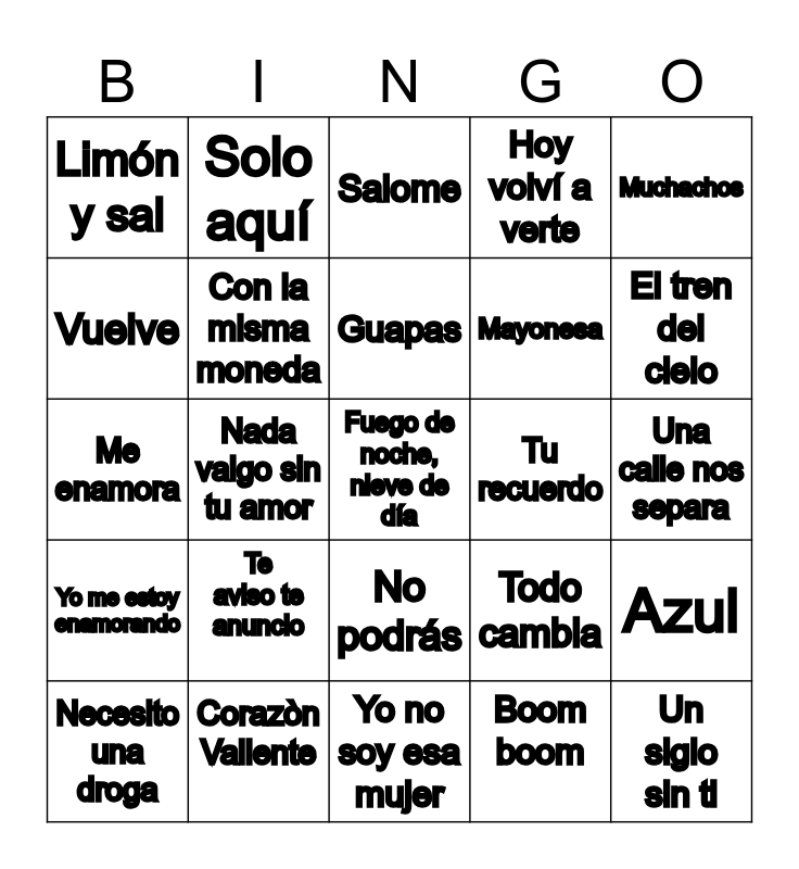 This bingo card has 41 words: Labios Compartidos, Nada valgo sin tu amor, Azúcar amargo, Mayonesa, Un siglo sin ti, Me enamora, Con la misma moneda, La tortura, Hoy volví a verte, Azul, Limón y sal, Solo aquí, No podrás, Todo cambia, Una calle nos separa, Vuelve, Corazòn Valiente, Salome, El parrandero, Muchachos, Necesito una droga, Te aviso te anuncio, Yo no soy esa mujer, Tu recuerdo, No me arrepiento de este amor, Vivir asi es morir de amor, 20 de Enero, Solo tus canciones, El tren del cielo, Torero, Mentia, Guapas, Boom boom, Una cerveza, Yo me estoy enamorando, Fuego de noche, nieve de día, Caraluna, Ahora te puedes marchar, Todos me miran, Hoy and Lloviendo estrellas.