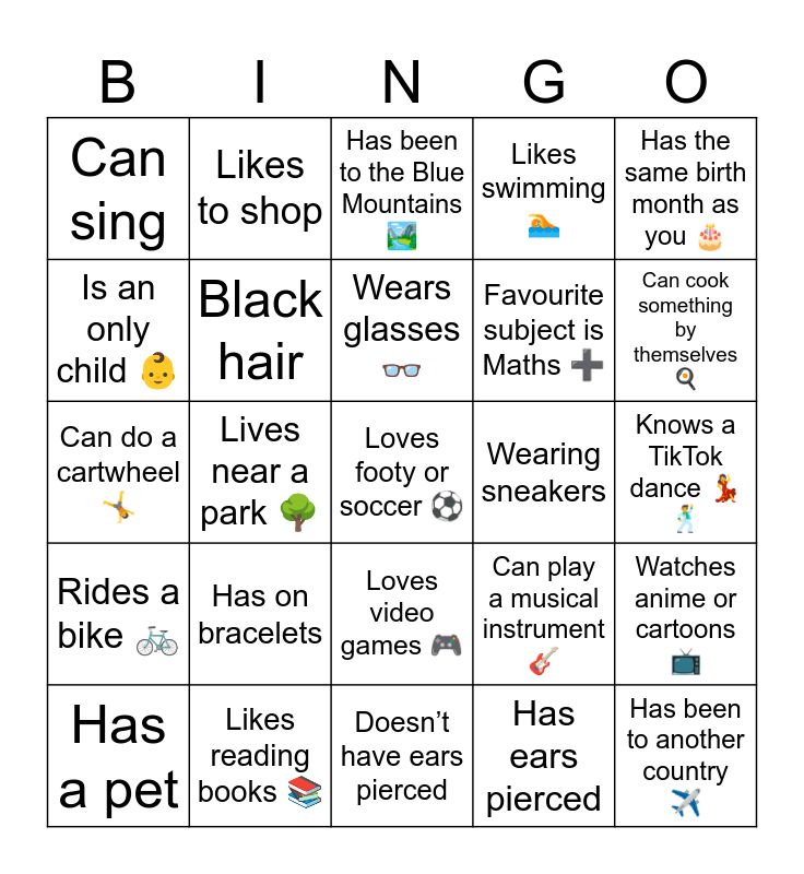This bingo card has a free space and 34 words: Have Brown Eyes, Has ears pierced, Has more than 3 siblings ๐ง๐ฆ, Can speak another language ๐ฃ๏ธ, Rides a bike ๐ฒ, Black hair, Has the same birth month as you ๐, Has a pet, Likes to shop, Has on something pink, Wears glasses ๐, Has been to the Blue Mountains ๐๏ธ, Loves drawing or art ๐จ, Wearing socks, Wearing sneakers, Can cook something by themselves ๐ณ, Likes reading books ๐, Can do a cartwheel ๐คธ, Has on bracelets, Can play a musical instrument ๐ธ, Loves video games ๐ฎ, Has eaten kangaroo or crocodile meat ๐ฆ๐, Can sing, Knows a TikTok dance ๐๐บ, Doesnโt have ears pierced, Has been to another country โ๏ธ, Likes swimming ๐, Has tried laksa or biryani ๐, Favourite subject is Maths โ, Is an only child ๐ถ, Has a family from another country ๐, Lives near a park ๐ณ, Watches anime or cartoons ๐บ and Has been on a train ๐.