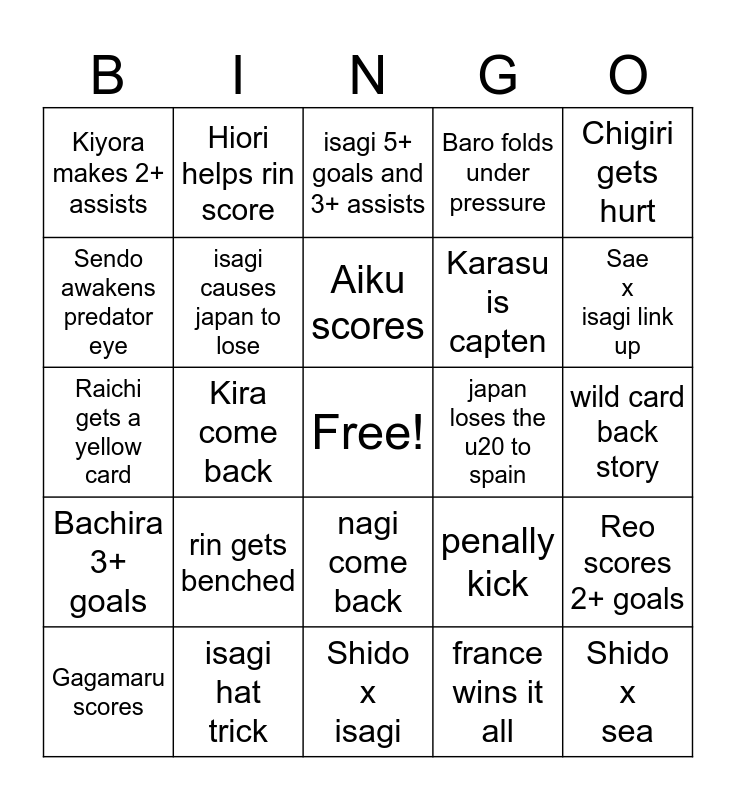 This bingo card has a free space and 24 words: rin gets benched, isagi hat trick, Aiku scores, Gagamaru scores, Chigiri gets hurt, Kiyora makes 2+ assists, Sendo awakens predator eye, Hiori helps rin score, japan loses the u20 to spain, nagi come back, Karasu is capten, Raichi gets a yellow card, penally kick, Reo scores 2+ goals, isagi causes japan to lose, france wins it all, wild card back story, isagi 5+ goals and 3+ assists, Sae x isagi link up, Kira come back, Shido x sea, Bachira 3+ goals, Baro folds under pressure and Shido x isagi.