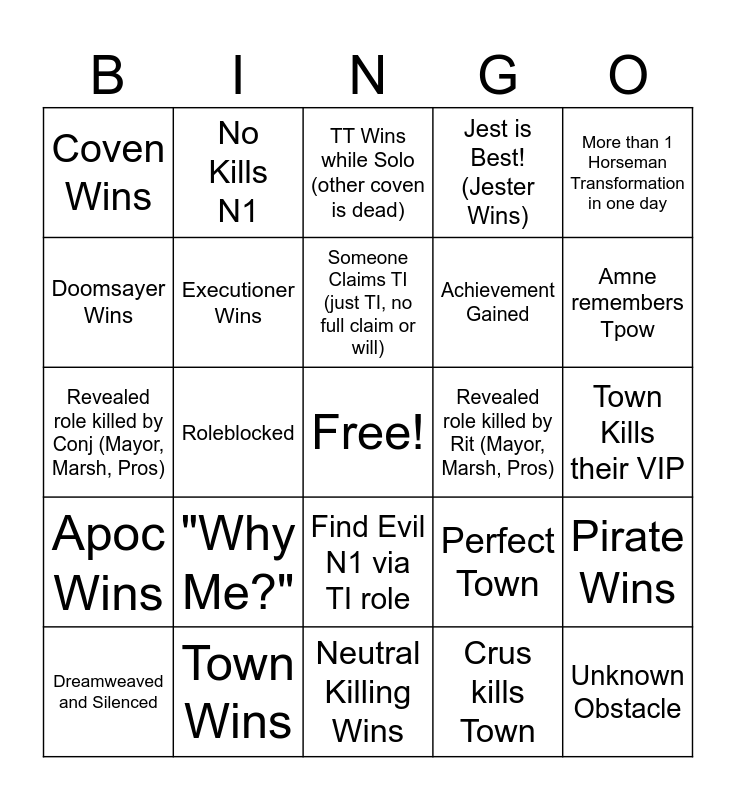 This bingo card has a free space and 24 words: "Why Me?", Town Wins, Someone Claims TI (just TI, no full claim or will), Dreamweaved and Silenced, More than 1 Horseman Transformation in one day, Coven Wins, Doomsayer Wins, No Kills N1, Revealed role killed by Rit (Mayor, Marsh, Pros), Find Evil N1 via TI role, Achievement Gained, Revealed role killed by Conj (Mayor, Marsh, Pros), Perfect Town, Pirate Wins, Executioner Wins, Crus kills Town, Town Kills their VIP, TT Wins while Solo (other coven is dead), Amne remembers Tpow, Roleblocked, Unknown Obstacle, Apoc Wins, Jest is Best! (Jester Wins) and Neutral Killing Wins.
