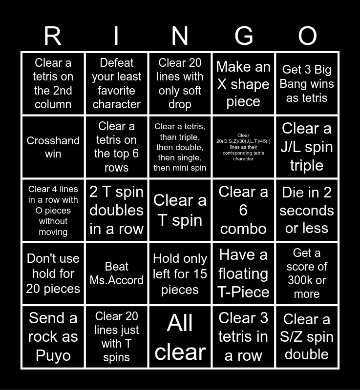 This bingo card has a free space and 31 words: All clear, 2 T spin triples in a row, 2 T spin doubles in a row, Washing machine, Clear a tetris on the 2nd column, Clear 20 lines with only soft drop, Clear a tetris on the top 6 rows, Have a floating T-Piece, Clear a 6 combo, Clear 3 tetris in a row, Die in 2 seconds or less, Clear a S/Z spin double, Clear a S/Z spin triple, Clear an I spin double, Clear a J/L spin triple, Clear an I spin triple, Get a score of 300k or more, Beat Ms.Accord, Don't use hold for 20 pieces, Hold only left for 15 pieces, Get 3 Big Bang wins as tetris, Clear a 4 combo on fusion, Send a rock as Puyo, Defeat your least favorite character, Clear 20(O,S,Z)/30(J,L,T)/45(I) lines as their corrisponding tetris character, Crosshand win, Make an X shape piece, Clear 4 lines in a row with O pieces without moving, Clear 20 lines just with T spins, Clear a tetris, than triple, then double, then single, then mini spin and Clear a tetris with your eyes closed.